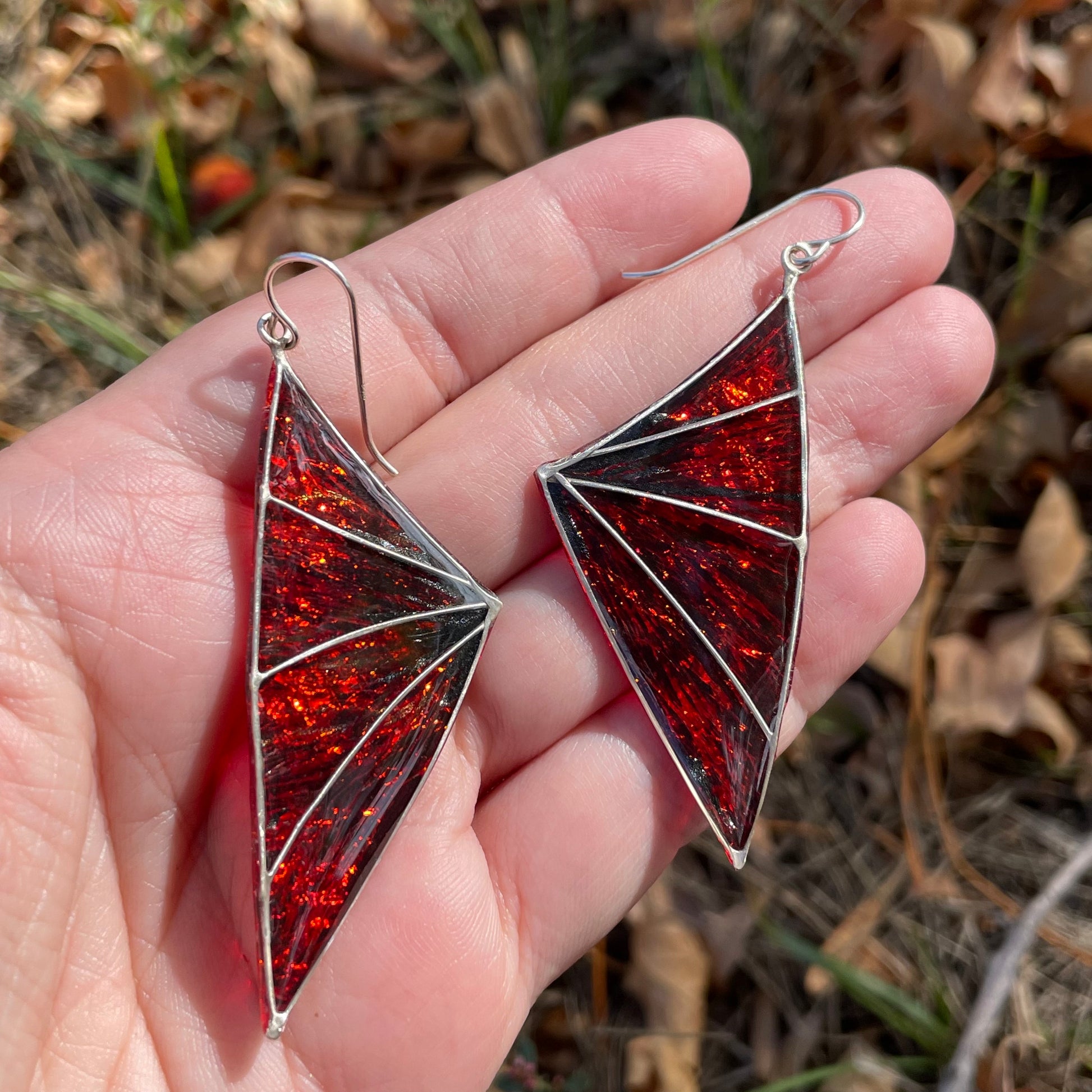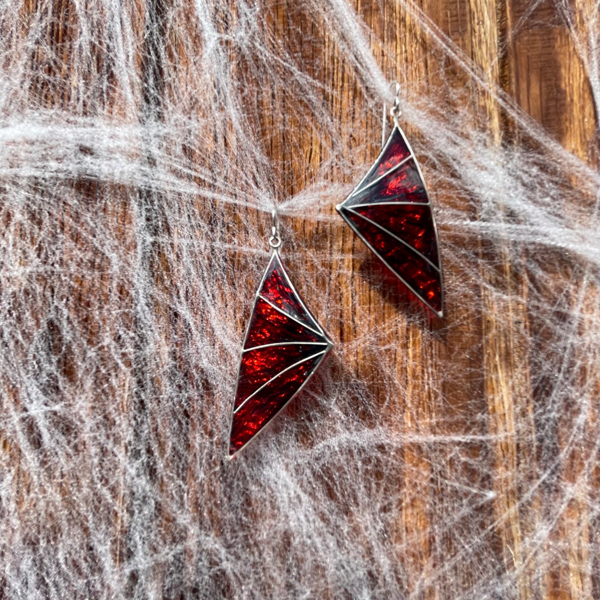 These stunning, one-of-a-kind Blood Red Bat Wings are absolutely KILLER!! They are alight with fiery reds, oranges and yellows with dancing black shadow details all over the place. These are certainly the perfect addition to an amazing costume or heck, just wear these earrings as your costume! They are light weight and very easy to wear - there will be no sagging or painful lobes with these big bold beauties.